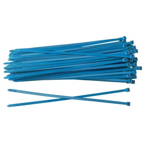 Pakke med 100 stk. detekterbare kabelbindere i blå kvalitetsplast. De måler 2,5 × 98 mm og leveres klar til brug.